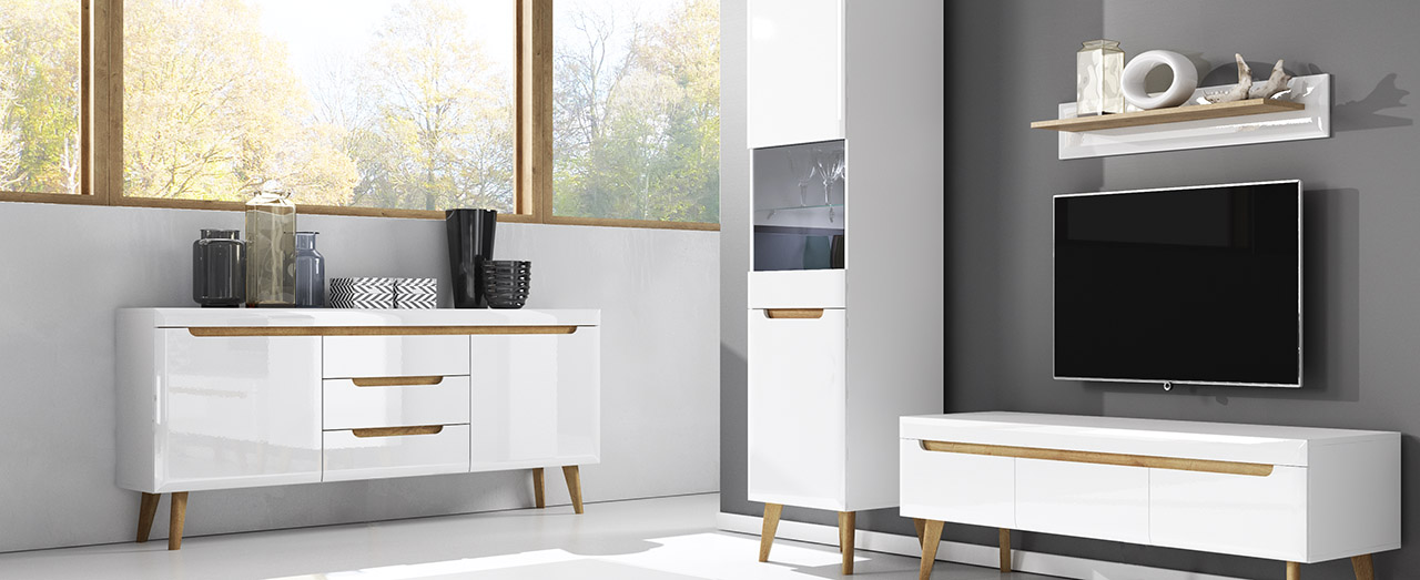 W kolekcji Nordi znajdziemy dwie szafki rtv, trzy komody, dwie witryny, stół, półka, ława oraz szafa. Wszystkie elementy dostępne są w dwóch wersjach kolorystycznych.